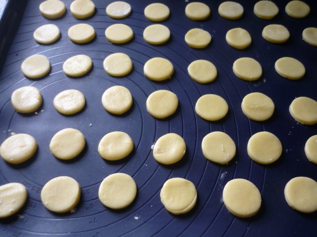 - Estiramos la masa con un grosor aproximado de medio centímentro y cortamos círculos de 3 cm. de diámetro. Los vamos poniendo en una bandeja de horno cubierta con una lámina de silicona o con papel de hornear.